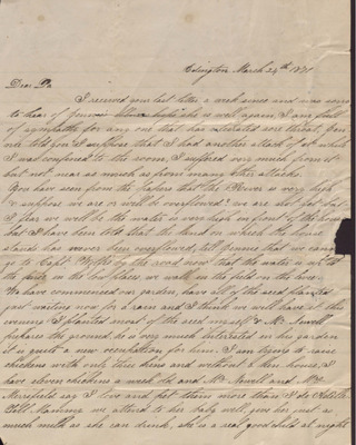 In this letter, dated March 24, 1871, Kate writes to her father to discuss the flooding around her home, what she is planting in her garden, how much she misses Mammy's assistance with her baby and her health.