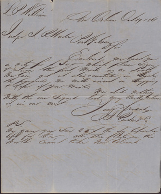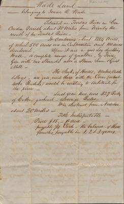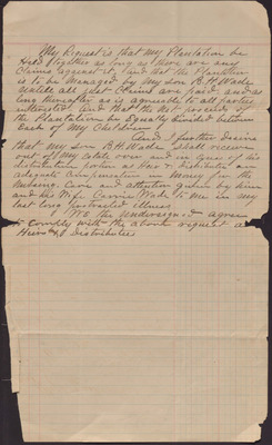 In this undated draft of a will, presumably Isaac R. Wade states that he wishes to keep his plantation going as long as the debts are paid and the interested parties are agreeable but outlines how the proceeds should be divided should it be sold. He goes on to state his desire that his son, B. H. Wade, receive a larger portion of the estate as compensation for the care nursing provided by him to Isaac R. Wade during his prolonged illness. An envelope addressed to Judge Isaac R. Wade in Claiborn County, Mississippi and postmarked Frogmore, Louisiana is included with the draft.