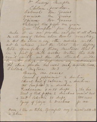 This handwritten recipe for cholera powder provides measurements for the ingredients, the uses for the mixture, and instructions on how and when to take it. A note on the back of the recipe claims that it is for Dr. Lindsey.