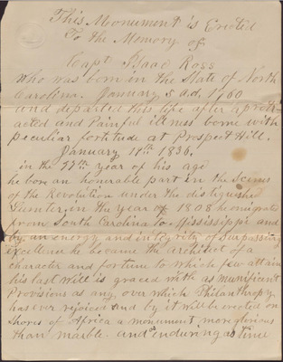 Papers of Isaac Ross, planter, of Prospect Hill, Jefferson County, Mississippi. Correspondence, statement of accounts, promissory notes, receipts, memoranda, and other papers pertaining to settlement of Ross' estate, especially concerning the will's provision for manumission of Ross' enslaved persons choosing emigration to Liberia. Includes correspondence of Ross' grandson, Isaac Ross Wade, as administrator of the estate, with the American Colonization Society; records of Wade's business transactions with Person and Company, New Orleans, Louisiana, and other cotton merchants; and business papers of Wade's son B.H. Wade. Correspondents include J. Hewitt, Natchez, Mississippi, and George L. Yerger, Jackson, Mississippi.
