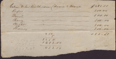 This torn sheet documents made to various people from an unknown person and also contains calculations of an ambiguous nature.