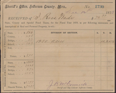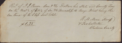 This undated receipt documents the payment made to R. M. Moore, the Sheriff and Tax collector of Claiborn County by J. J. Person for the state and county property taxes of his share of the I. Ross estate.