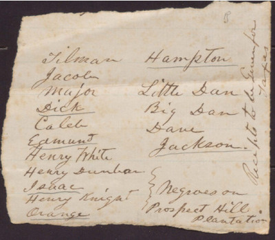 This undated documents lists the names of the enslaved persons on Prospect Hill Plantation for the purposes of a tax receipt.