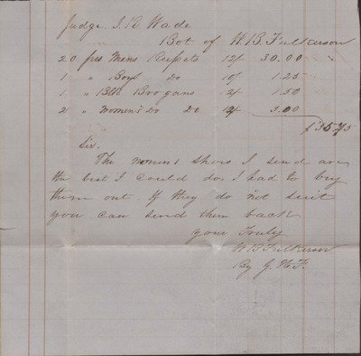 In this letter, W. B. Fulkerson writes to Judge I. R. Wade to inform him of purchases made on Wade's behalf.