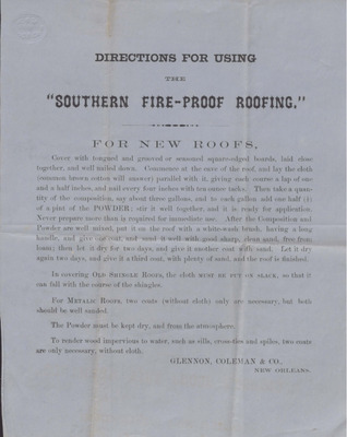 This sheet provides directions for new roofing methods with various roofing materials provided by Glennon, Coleman, and Co. in New Orleans, Louisiana.