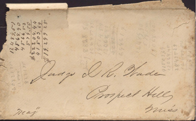 This torn and stained envelope is addressed to Judge I R (Isaac R.) Wade in Prospect Hill, Mississippi. Mathematical figures are scribbled on the front and back of the envelope.