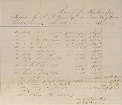 This invoice documents the shipment of food and household goods shipped to Isaac R. Wade by J. J. Person and Co. per Lovrick V. Fullers on the steamboat Charmer at a cost of three hundred ninety-seven dollars and eighty-one cents.