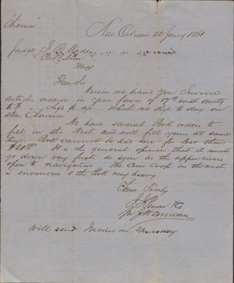 In this letter, dated January 22, 1861, J. H. Duncan writes to Isaac R. Wade on behalf of J. J. Person to let Wade know that an invoice is included and the items he ordered are being shipped the same day. He goes on to explain why the pork he ordered is missing from the shipment and what the expectations are for the pork and corn market.