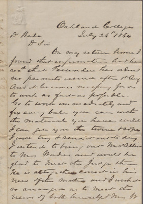 Letter, Mr. G. Williams to Isaac R. Wade, July 24, 1864