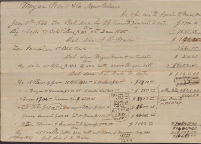 This account statement documents the charges for purchases and taxes for cotton, pork, farm equipment, and enslaved persons between Meyer Weir and Co. and Isaac R. Wade from January 5 1866 to January 1, 1867.