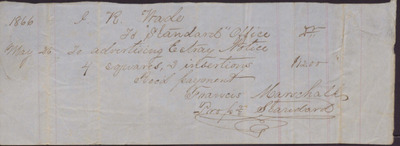 This receipt, dated May 26, 1866, documents payment made by Issac R. Wade to Francis Marshall, the proprietor of the "The Standard", for publishing four square insertions for advertising.