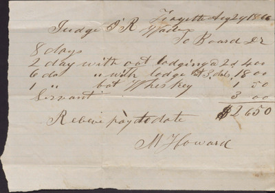 This receipt, dated August 29, 1866, documents the payment made by Isaac R. Wade to M. Howard board and lodging in Fayette, Mississippi for nine days at a cost of $26.50, including amenities.