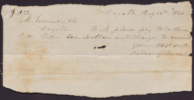 This note, dated August 29, 1866, requests that M. Eiseman and Co. pay ten dollars to W. Villines on behalf of Isaac R. Wade.
