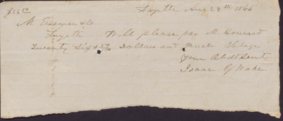 This note, dated August 29, 1866, requests that M. Eiseman and Co. pay M. Howard twenty-six dollars on behalf of Isaac R. Wade.