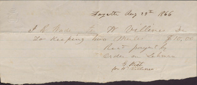 Receipt, J. R. Wade to W. Villines, August 29, 1866
