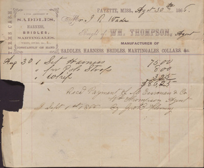 This receipt, dated December 31, 1866, documents the payment made by Isaac R. Wade to William Thompson for the purchase of horse tack. The payment is dated as received on January 8, 1867 by John Fliming.