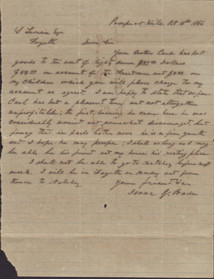 In this letter, dated October 18, 1866, Isaac R. Wade writes to Y. Leman to update him on Leeman's brother Carl since his arrival to Prospect Hill where he has been staying with Wade.