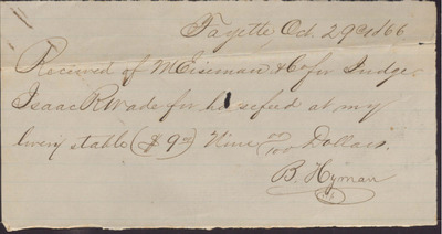 This receipt, dated October 29, 1866, documents the payment made to B. Hyman by M. Eiseman and Co. on behalf of Isaac R. Wade for horse feed at Hyman's livery stable at a cost of nine dollars.