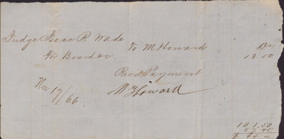 This receipt, dated November 17, 1866, documents made by Isaac R. Wade to M. Howard for boarding fee.