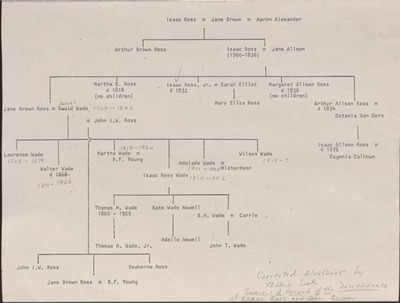 This genealogy chart shows the direct line of descendants of the Isaac Ross and Jane Brown lineage. The chart was corrected in pencil by archivist, Mattie Sink on March 24, 2005 with the use of "A Record of the Descendants of Isaac Ross and Jane Brown."