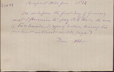 In this promissory note, dated January 1, 1872, Dan Abbo promises to repay B. Y. Wade two hundred and forty dollars by the following January.