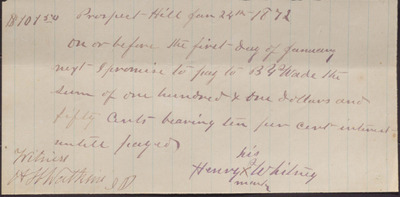 In this promissory note, dated January 24, 1872, Henry Whitney promises to repay B. Y. Wade one hundred and one dollars and fifty cents with a ten percent interest by the following January.