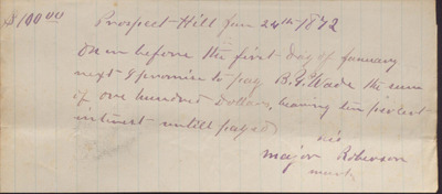 In this promissory note, dated January 24, 1872, Major Roberson promises to repay B. Y. Wade one hundred dollars at a ten percent interest due by January of the following year.