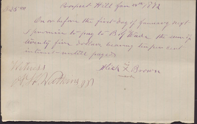 In this promissory note, dated January 24, 1872, Hick Brown promises to repay B. Y. Wade twenty-five dollars at a ten percent interest due by January of the following year.