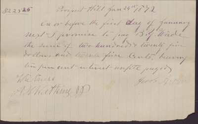 In this promissory note, dated January 24, 1872, Jacob Archer promises to repay B. Y. Wade two hundred and twenty-five dollars and twenty-five cents at ten percent interest to be repaid by January of the following year.