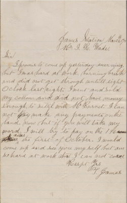 In this letter, dated March 26, 1875, T. James writes to Isaac R. Wade to tell him that he's sold his cotton but did not have enough money to settle with a debtor and can not make payments on his land. He asks Wade to extend his payment timeline to October first. An envelope addressed to Wade at Prospect Hill is included with the letter.