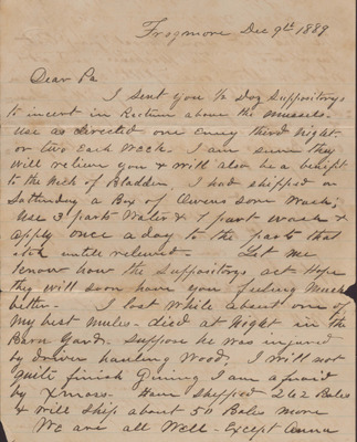 In this letter, dated December 9, 1889, B. Y. Wade writes to his father, Isaac R. Wade, to provide him with some home remedies for digestion problems. He goes on to update his father on the loss of a mule, his cotton crop, and his family's health.
