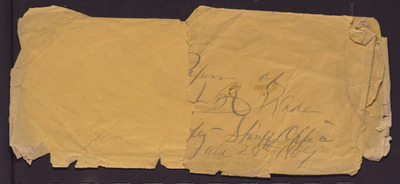 The front portion of this envelope has been torn in half. "Papers of I. R. Wade [torn and missing] Sheriffs Office June 24th 1869" is visible on the right side of the torn piece.