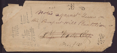 "Notes against Lessees on the Prospect Hill Plantation" is written across the top of this envelope and "B. Y. Wade Esq" is written and marked through at the bottom. Some numerical calculations are written on the left side of the envelope and in the lower right corner. The edge of the envelope is torn and worn.