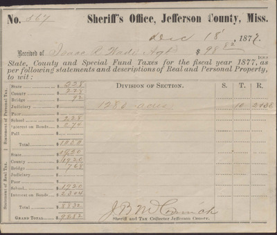 Tax Receipt, Isaac R. Wade from Sheriff's Office, December 18, 1877