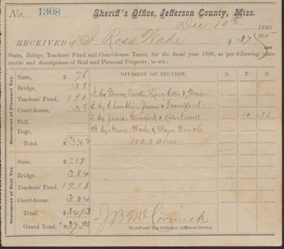 Tax Receipt, Isaac R. Wade from Sheriff's Office, December 10, 1880