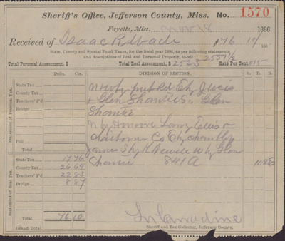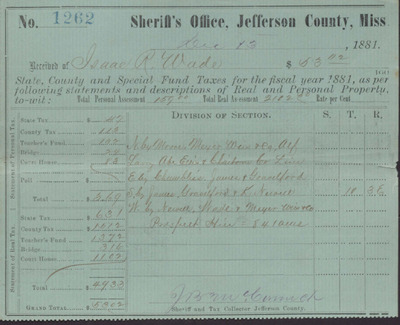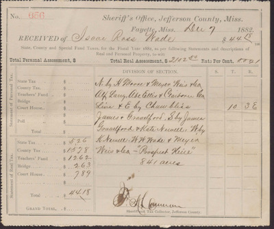 Tax Receipt, Isaac R. Wade from Sheriff's Office, December 07, 1882