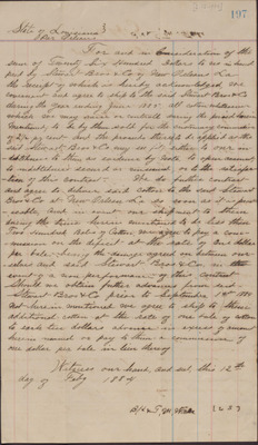 In this copy of a cotton contract, dated February 12, 1884, B. H. and G. M. Wade promise to send all cotton produced by them to Stewart Bros. and Company for a year at the cost of two thousand, six hundred dollars ending in June of 1885. The contract further outlines the terms of the agreement and the delivery terms.