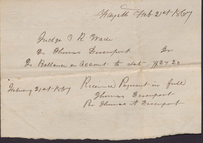 Receipt, Thomas Davenport to Isaac R. Wade, February 21, 1867