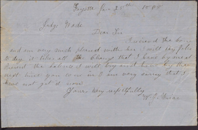 In this letter, dated January 25, 1868, W. J. Friar writes to Isaac R. Wade to let him know that he is pleased with a purchase he made recently and promises to pay him in full the next time Wade comes in.