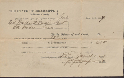 Receipt, Isaac R. Wade from Jefferson County Mississippi Probate Court Office, March 23, 1868