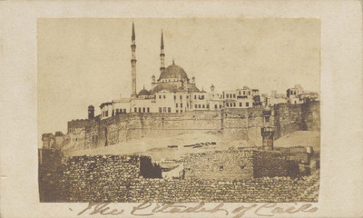 The Cairo Citadel is pictured in this sepia toned photograph, a sprawling multi-level building with domes, two towers, and a brick wall surrounding it.
