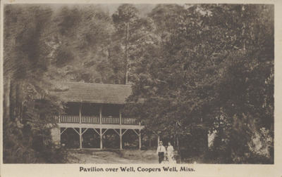 The a black and white photograph of the pavilion over the well at Cooper's Well hotel near Raymond, Mississippi is featured on this postcard. Trees surround the pavilion and a group of people are pictured on the path to the well. The title of the card is printed along the bottom edge of the card. Cooper's Well was known in the late 19th century and early 20th century for it's healing properties. It has been the home of a hotel, a resort, and a spa.
