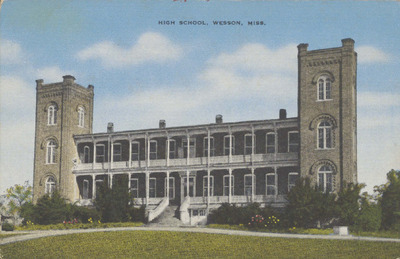 A color image of the high school at Wesson, Mississippi, is featured on this postcard. The school is a two story, brown brick building with a square, three story tower on each end. The windows on the towers are arched with dental molding and white porch railing and thin columns line the front porch and second story balcony. Shrubs and flower bushes line the front of the building, flanking the steps to the front entrance. The title of the card is printed along the top of the card.