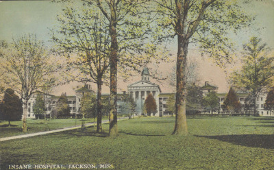 A color illustration of the Insane Hospital in Jackson, Mississippi is featured on this postcard. A cupola is in the center elevation of the long, multi-level building and the hospital is pictured behind several trees amidst an expansive lawn. The title of the card is printed in white along the bottom left edge of the image.