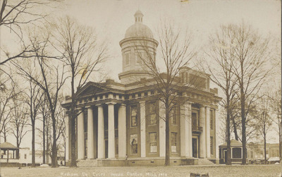 A sepia toned photograph of the Madison County courthouse in Canton, Mississippi, a two story building with four round columns along the front at the entrance and a tall, domed cupola in the center of the roof. Trees are pictured around the courthouse and smaller structures are pictured behind and to the left of it. The title of the card is written in white along the bottom edge of the image.