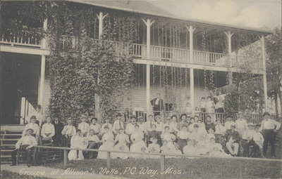 A photograph of people gathered in front of a building at Allison's Wells in Way, Mississippi (Madison County) is featured on this postcard. The building is a white, two story, clapboard building with a long front porch and second story balcony, both lined with white columns and railings. Ivy is growing up the rails and columns. A group of people in early 20th century clothing are standing on the porch and seated on the lawn in front of the building. The title of the card is written in white along the bottom of the image. Evidence of a smudged postmark is on the back of the card near the green, one cent, Benjamin Franklin postage stamp. A note is written to Mrs. Rogers from Mrs. Latimer on the left half of the back.