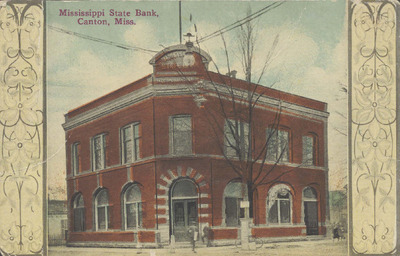 A color illustration of the Mississippi State Bank in Canton, Mississippi, a two story, red brick corner building with arched windows on the bottom floor is featured on this postcard. A person is depicted walking into the building. Foral details boarder the image on each end. The title of the card is printed in red along the upper left.