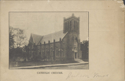 A black and white photograph of a Catholic church in Jackson, Mississippi is featured on this postcard. The church is a one story building with arched windows and a bell tower at the front entrance. The title of the card is printed beneath the image and "Jackson Miss" is written below it.