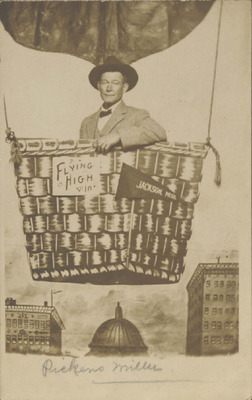 A sepia toned image of a man in a hot air balloon is featured on this postcard. "Flying High in Jackson, Miss." is printed on a sign and pennant affixed to the basket of the hot air balloon and the man is wearing a suit and dark hat. Images of the tops of buildings is pictured beneath the basket. "Pickens Miller" is written in pencil below the image.