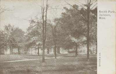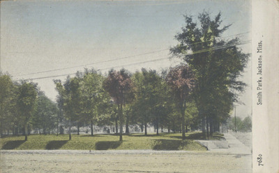 A color image of Smith Park in Jackson, Mississippi from across the street is featured on this postcard. Lush, green, grass and trees are depicted with a sidewalk running among them from a set of steps from the sidewalk a the street. Structures are pictured in the distance beyond the trees. The title of the card is printed sideways to the right of the image.